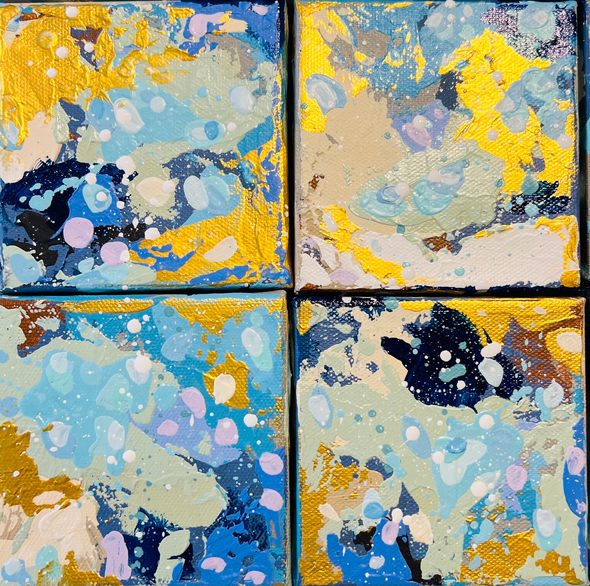 Created with layers of cool blues, gold glimmers, and soft snowy pastels, these minis feel like tiny bursts of frozen magic. Each one echoes the same palette, yet every canvas has its own soul, its own sparkle, its own story.