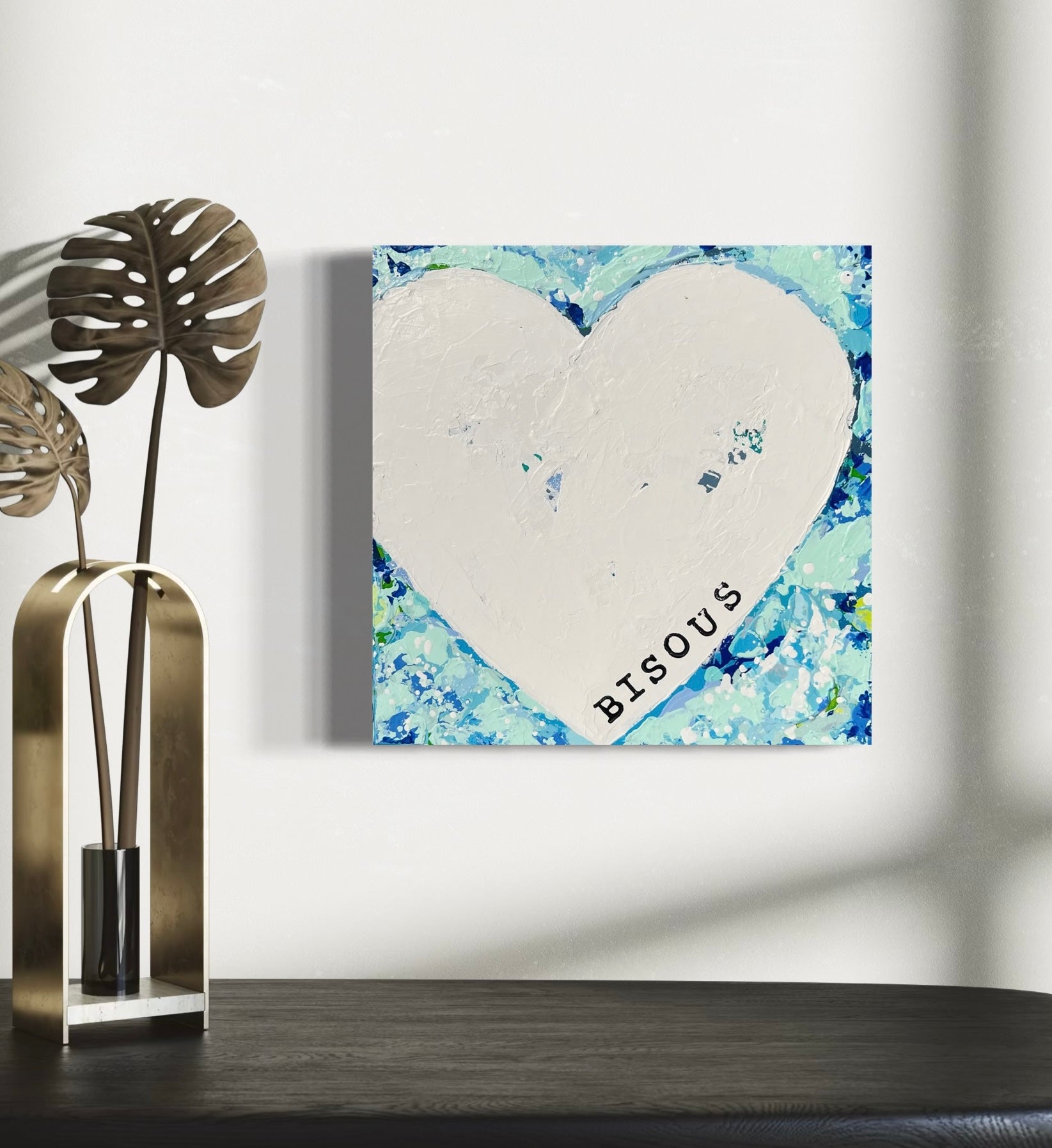 Layers of cool hues drift between depth and light, revealing traces beneath the calm. Soft layers blend and dissolve, resting in quiet harmony. Amid the calm, a bisous (kiss), black and stamped, tender and fleeting, resting quietly across the canvas.