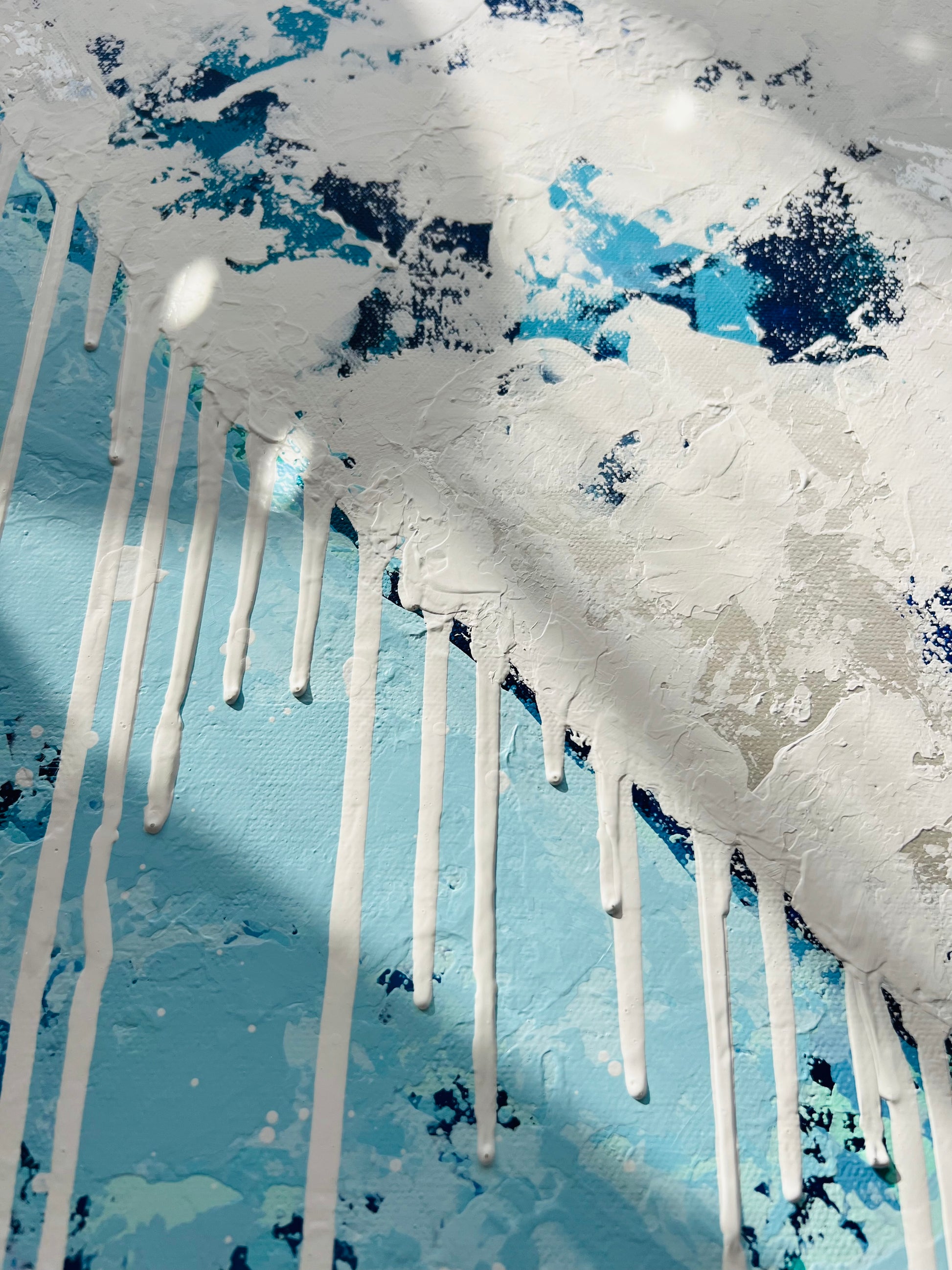 “Where Love Washes In” is a layered acrylic painting that captures the calm power of the sea and shades of blue cascade and drip over a white heart, revealing soft bursts of color beneath—like waves gliding over a hidden shore. A subtle shimmer of white pearl catches the light, reminiscent of a seashell’s inner glow—quiet, radiant, and timeless—reminding us that love, like the tide, always returns. Original artwork. 36"x 36" acrylic paint on gallery wrapped canvas that presents 1.5" from the wall. Sides are painted, ready to hang. Signed, titled and dated on back of artwork.